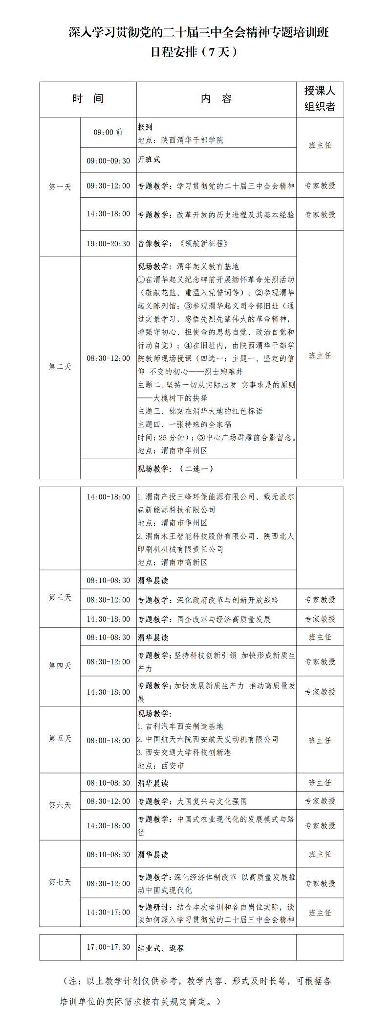 深入学习贯彻党的二十届三中全会精神专题培训班教学计划(7天)