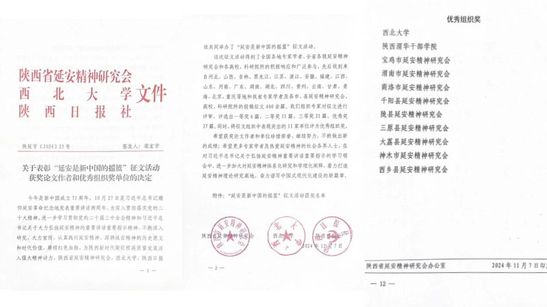 在庆祝新中国成立75周年,习近平总书记瞻仰延安革命纪念地发表重要讲话两周年之际,由陕西省延安精神研究会、西北大学、陕西日报社联合举办的“延安是新中国的摇篮”专题研讨会于11月10日-11日在陕西西安召开。从研讨会获悉,在此次研讨活动全国征文中,先后收到来自各省(自治区、直辖市)高校、科研院所专家学者及各地延安精神研究会投稿征文400余篇,经组织专家评审,11家单位、75篇论文荣获表彰,陕西渭华干部学院荣获优秀组织奖。