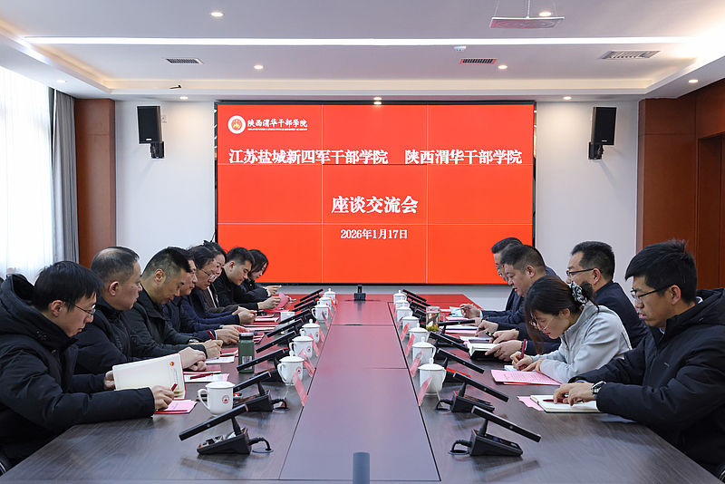 为深入贯彻习近平总书记关于干部教育培训工作的重要论述,加强党性教育干部学院之间的交流合作,2026年1月16日—17日,江苏盐城新四军干部学院常务副院长、中共盐城市委党校常务副校长赵国锋一行8人来我院考察调研并进行座谈交流。我院党委委员、副院长王锋,党委委员、副院长韩宝林,党委委员、副院长吴超及各内设机构负责同志参加座谈。