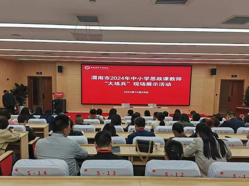 为深入学习贯彻习近平新时代中国特色社会主义思想和党的二十大、党的二十届三中全会精神,认真落实习近平总书记在学校思想政治理论课教师座谈会上的重要讲话精神,有效提升中小学思政课教学质量,充分发挥以赛促教、以赛促提升的作用,10月29日,渭南市2024年中小学思政课教师“大练兵”现场展示活动在陕西渭华干部学院举行。通过学校、县市区层层练兵选拔,来自全市的88名教师,分小学思政、初中思政、高中思政、课程思政、特殊教育5个组别进行了现场展示。