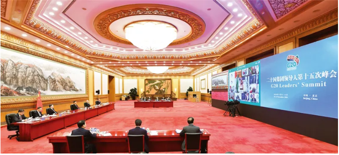2020年11月22日晚,国家主席习近平在北京以视频方式出席二十国集团领导人第十五次峰会第二阶段会议,重点阐述关于可持续发展问题的看法。 新华社记者 李响/摄