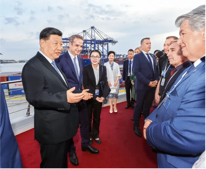 当地时间2019年11月11日,国家主席习近平和夫人彭丽媛在希腊总理米佐塔基斯夫妇陪同下,共同参观中远海运比雷埃夫斯港项目。这是习近平与当地员工代表亲切交谈,询问他们的工作和生活情况。 新华社记者 谢环驰/摄