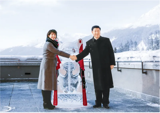 2017年1月17日,国家主席习近平同瑞士联邦主席洛伊特哈德在达沃斯共同启动中瑞旅游年。两国元首在熊猫冰雕像和印有中瑞两国国旗及“中瑞旅游年”字样的滑雪板旁合影留念。 新华社记者 丁林/摄