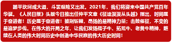 2021年,农历牛年,又一个“历史时刻”,又一个“关键时间”。站在“两个一百年”的历史交汇点,千百年来中华民族孜孜以求的小康梦想即将实现,解决困扰中华民族几千年的绝对贫困问题取得历史性成就;开启全面建设社会主义现代化国家新征程,向第二个百年奋斗目标进军,正在召唤我们以全新的状态去奋斗,这是人生之大幸、无上之荣光!踏平坎坷成大道,斗罢艰险又出发。2021年,我们将迎来中国共产党百年华诞。回首来时,每一步都不是轻而易举,每一步都付出了艰辛努力;眺望前路,必定会面临这样那样的风险挑战,甚至会遇到难以想象的惊涛骇浪。我们要以怎样的精神状态,在化危为机中赢得历史主动,在攻坚克难中焕发新的气象?“发扬为民服务孺子牛、创新发展拓荒牛、艰苦奋斗老黄牛的精神,永远保持慎终如始、戒骄戒躁的清醒头脑,永远保持不畏艰险、锐意进取的奋斗韧劲,在全面建设社会主义现代化国家新征程上奋勇前进,以优异成绩庆祝中国共产党成立100周年!”习近平总书记掷地有声的话语,振奋着新时代的精气神,这是风雨无阻向前进的奋发姿态,这是越是艰险越向前的奋斗豪情!百年奋斗,圆梦正在今朝;千秋伟业,百年只是序章。在前进的道路上,只要精神上站得住、站得稳,中华民族就能在历史洪流中屹立不倒、挺立潮头。